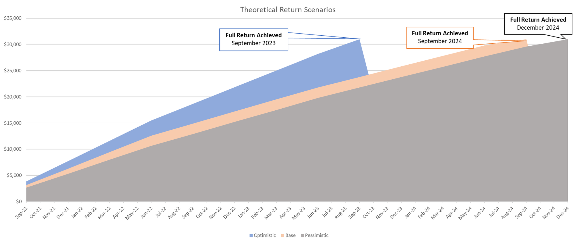 Fixed-return investments are designed for younger catalogs such as this. Knowing the total return in advance helps reduce the overall risk profile. To that effect, below are three return scenarios we created to approximate the time it may take to collect the Total Return. These scenarios were designed based on an analysis of the earnings history to date.